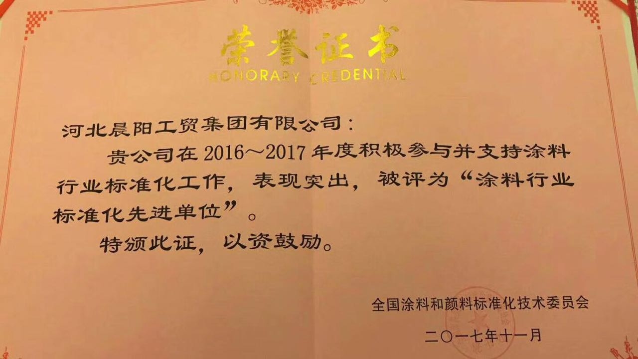 近日,经全国涂料和颜料标准化技术委员会的评审,河北晨阳工贸集团有限公司在2016~2017年度行业标准化工作中表现突出,积极参与了《自行车用水性涂料》等国家及行业标准的起草,被评为“涂料行业标准化先进单位”。