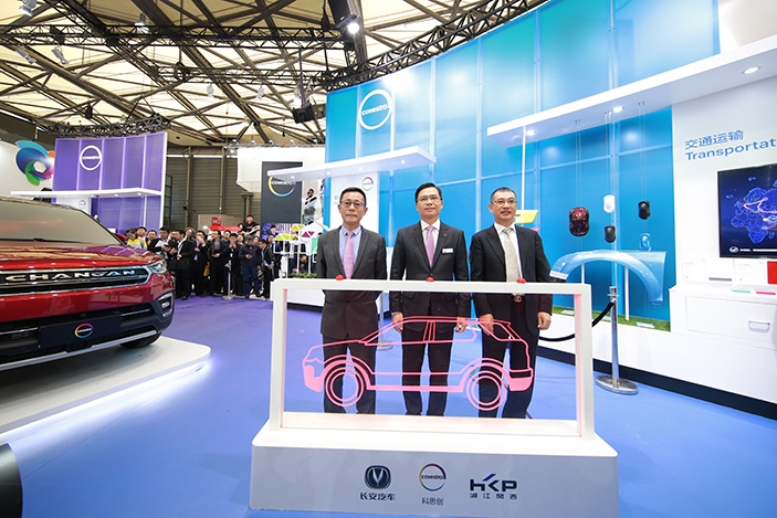 (左起)长安汽车工艺部技术部部长张劲松,科思创涂料、粘合剂及特殊化学品业务部亚太区高级副总裁钟小斌,湖南湘江关西涂料有限公司董事兼常务副总经理黄黎锋为CS55展车揭幕
