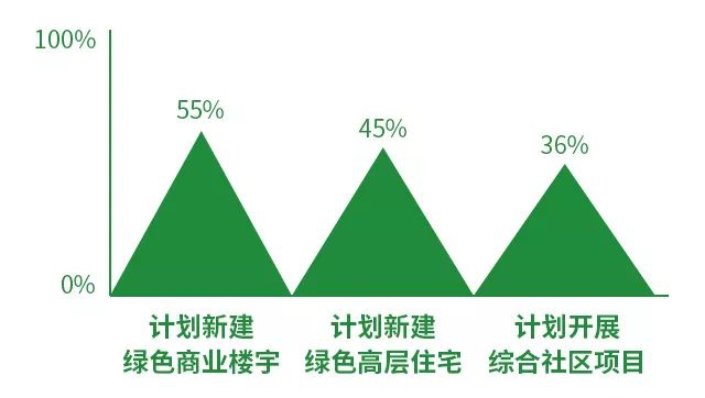 其次,由DodgeData&Analytics公司和UnitedTechnologies公司联合发布的《2016全球绿色建筑趋势报告》数据显示,在被访中国企业中,未来三年计划投资绿色项目的,有55%计划新建绿色商业楼宇,45%计划新建绿色高层住宅,36%计划开展综合社区项目。
