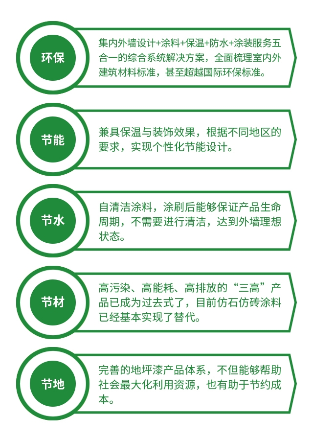绿色涂装除了有保护作用、特种功能等基础作用外,还拥有装饰作用这一附加值。善用绿色涂装即有机融合技术,色彩能有效达到整体建筑的视觉冲击和美观效果,提升建筑灵魂和气质,满足居住者的功能与心理的双重需求。