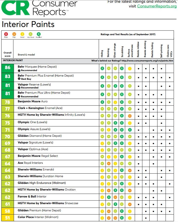 近日,美国知名第三方中立价值评估机构——《消费者报告》(Consumer Reports)公布评选了各级别中最值得推荐的10款涂料,并公布了内墙涂料(Interior Paints)评分和测试结果。