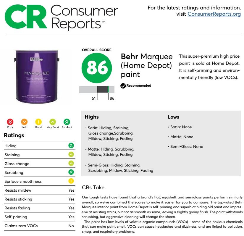 此外,被评为优秀等级的产品包括:Behr Marquee(Home Depot)涂料综合评分为86,Behr Premium Plus Ultra(Home Depot)涂料综合评分为81,Valspar Reserve(Lowe’s)综合评分为81,Behr Premium Plus Enamel(Home Depot)涂料综合评分为83。Behr百色熊旗下三款产品均被评为优秀。