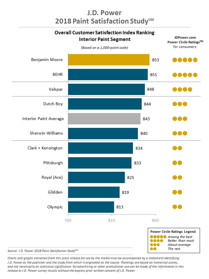室内涂料排名方面,本杰明摩尔(Benjamin Moore)以853的分数在室内涂料品牌中的客户满意度排名最高,在实际应用、耐用性、产品供应、和保修/保证方面表现尤其出色。百色熊(BEHR)以851分位列第二,在店内彩色显示器和印刷材料系数中表现最好。威士伯(Valspar)则以843分排名第三。