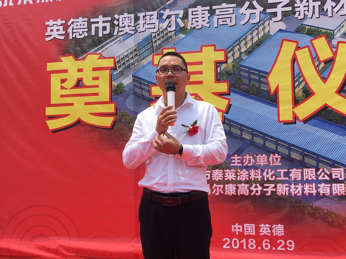 6月29日,英德市澳玛尔康高分子新材料有限公司开工奠基仪式在英德市东华镇鱼湾清华工业园举行。英德市副市长潘斌,清远华侨工业园管委会副主任潘虹,广东省涂料行业协会秘书长吕水列,中山市泰莱涂料化工有限公司总经理贺佑康,珠海连冠建材有限公司总经理邓海文,英德市第一建筑公司刘志坚等领导嘉宾,以及新闻媒体出席了奠基仪式。