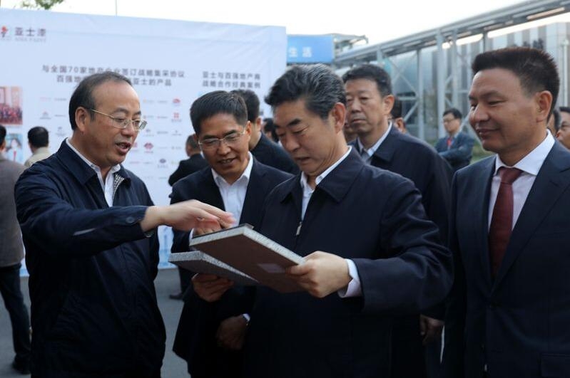 亚士创能董事长李金钟,副总裁王永军向考察团领导汇报了亚士集团、亚士产品和亚士创能滁州智能制造基地投资建设的情况;省考察组一行饶有兴致地参观涂料自动化生产线和自动化立体仓库,并不时驻足与李金钟董事长进行交谈。