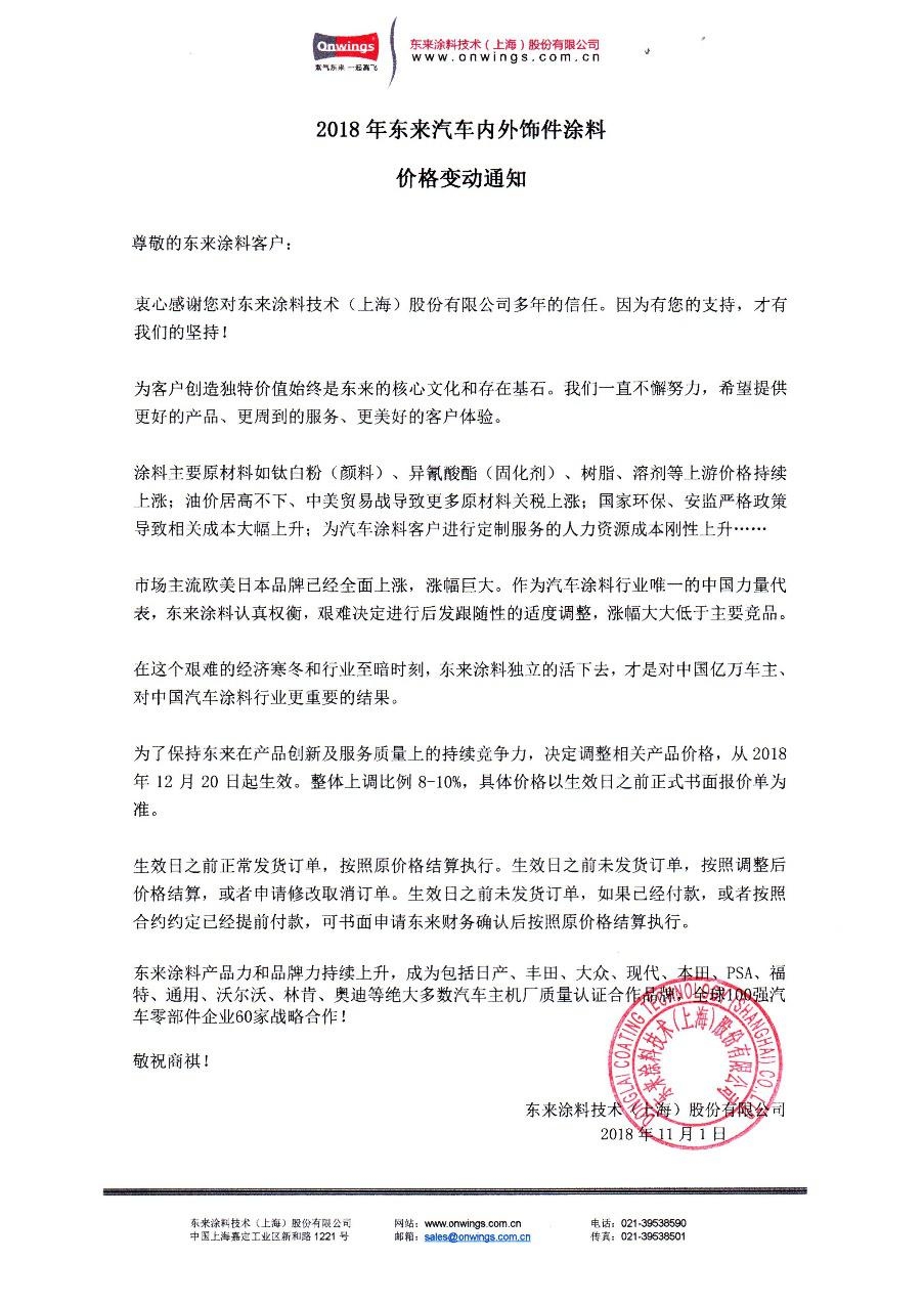 11月1日,国内最大汽车内外饰件漆生产商东来涂料宣布将启动汽车内外饰件涂料价格上涨。价格调整将于2018年12月20日起生效,上调比例8-10%,或者根据与客户的合同许可。
