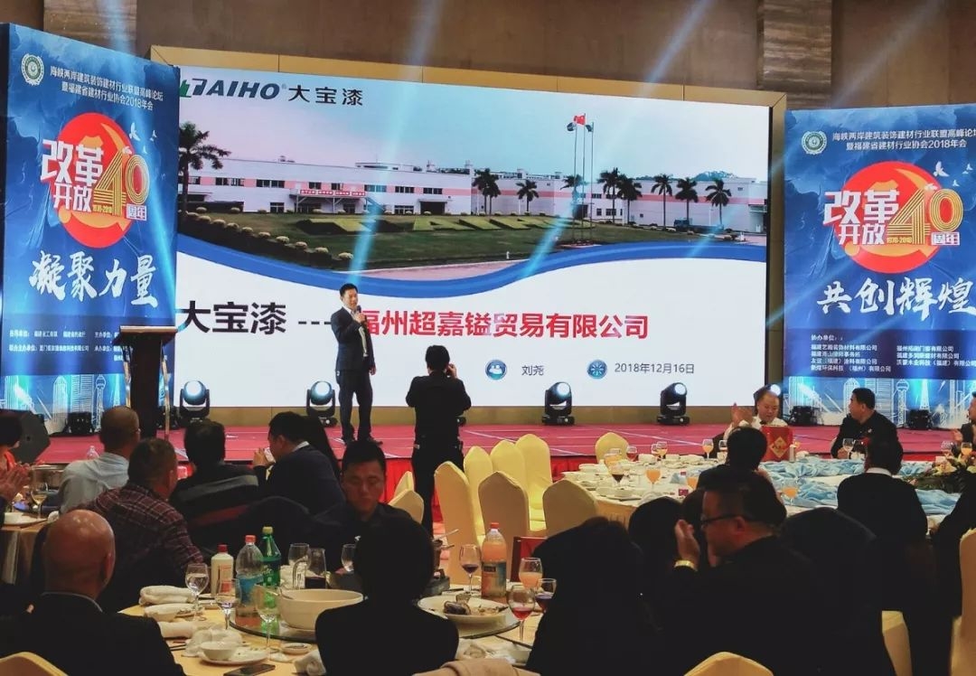 福州大宝作为福建省建材行业协会副会长单位,一直以来积极支持协会组织的各项活动,并充分利用协会组织的这个平台,做好大宝漆品牌宣传。会上,福州大宝蔡总发言,他表示今天的会议带来的是新的机遇和动力,未来福建省建材行业发展指日可待。随后,大宝漆华东三区业务主管刘尧上台作大宝漆企业概况分享。他从大宝漆发展历程、产品体系、大宝荣誉、合作支持等多个方面进行介绍。他着重讲解了大宝特色产品、工艺及服务,让与会嘉宾感受到大宝漆的专业与创新。最后他强调,靠单打独斗,很难有更大的发展,只有资源共享、抱团发展、才能做大做强。