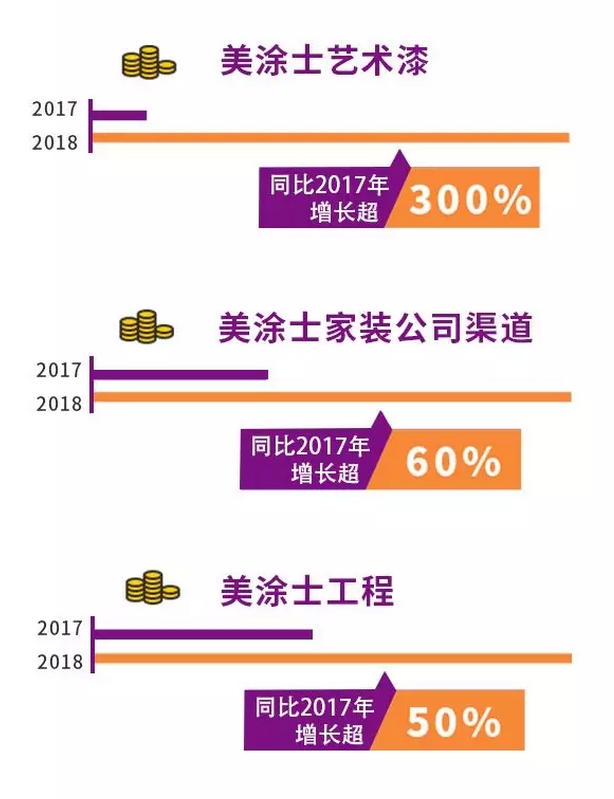 涂界记者1月2日获悉,美涂士去年最后一天公布了2018年业绩:艺术涂料业务同比增长300%,家装公司渠道业务同比增长超60%,工程业务同比增长超50%。
