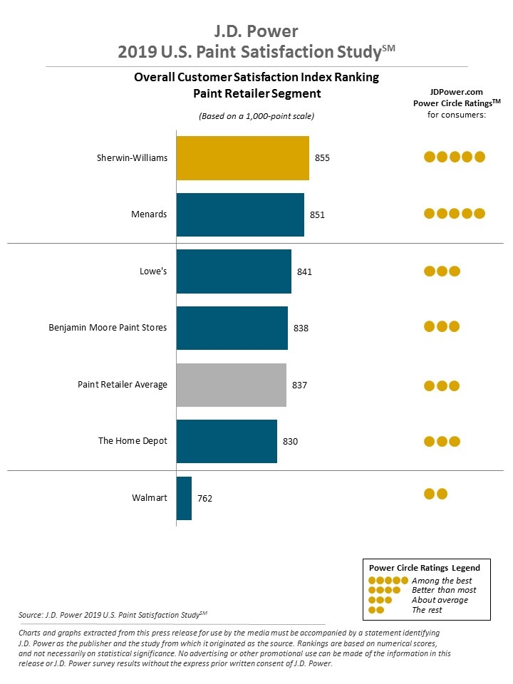 调查研究显示,宣伟以855的高分在油漆零售商市场中的客户满意度排名最高,Menards以851分排名第二位,劳氏(Lowe's)以841分排名第三位,本杰明摩尔涂料店、家得宝(Home Depot)、沃尔玛(Walmart)分别为得分838分、837分、830分、762分,分别排名第4-6位。