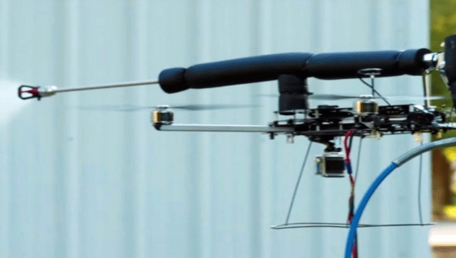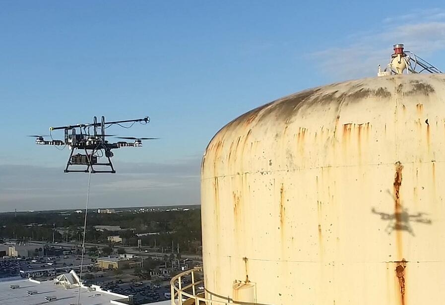Apellix利用一个四轴飞行器,通过软管和栓绳与地面基站和油漆材料相连接,无人机可以在建筑物的表明均匀喷漆,这有可能成为摩天大楼或船只刷漆的得力助手。
