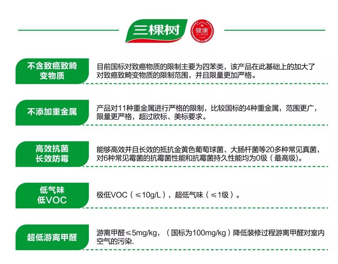 涂界记者注意到,三棵树美好生活内墙精装产品体系均符合三棵树“健康+”五项标准,低气味、低VOC、超低游离甲醛等,多项指标远低于十环标准的要求。此外,产品某些指标还超过欧标、美标要求。