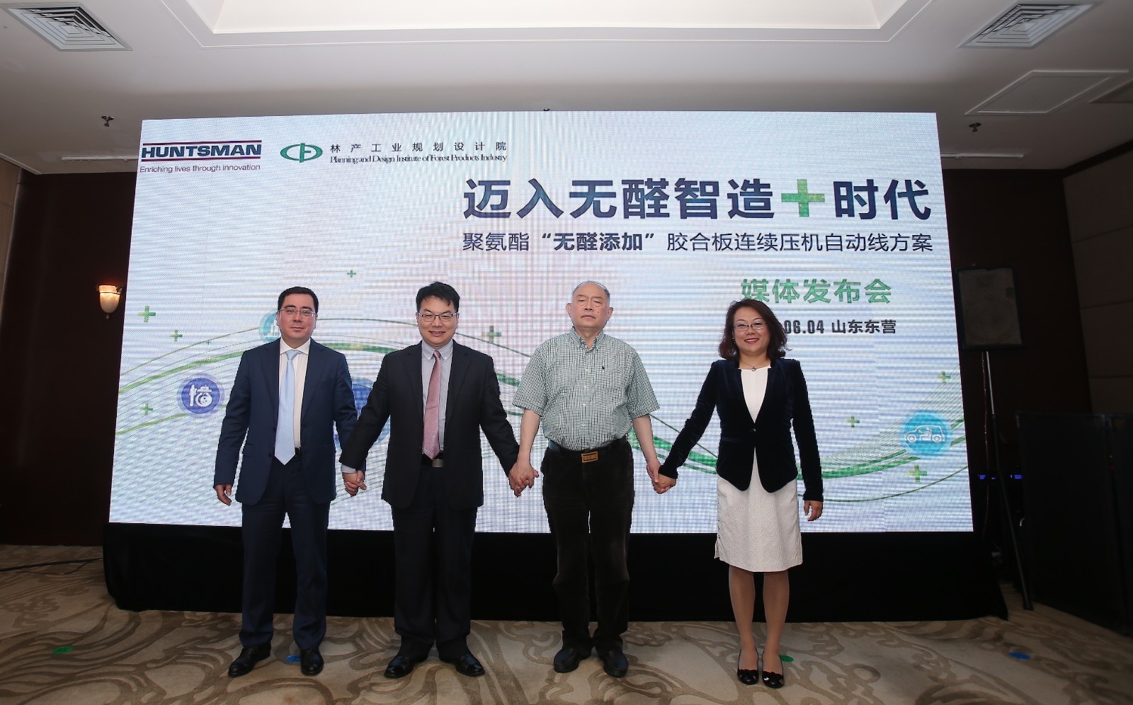 6月4日,亨斯迈公司聚氨酯事业部复合木制品总经理刘雪红在聚氨酯 “无醛添加”胶合板连续压机自动线方案发布会上提出当前中国人造板材中胶合板的生产难题,并发布中国首条聚氨酯 “无醛添加”胶合板连续压机自动线方案。