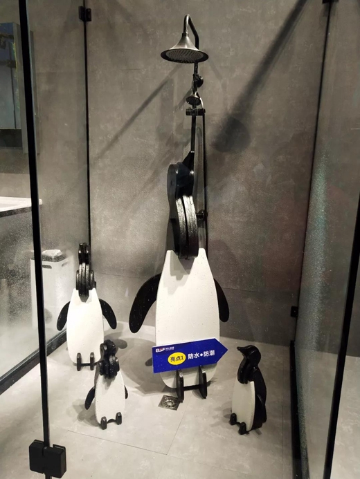 木制的企鹅模型置于一方沐浴的空间内,淋头的水不停地冲流在企鹅的头上,在淋湿的环境下长期保持木器不变形、不发霉。7月8日至11日举行的广州建博会A2馆28号展位上,巴德士集团旗下的博士家居用形象生动的方式,展现了其在木器粉末涂料领域的先进实力,以及系列粉末家具产品具有超强的防水、防潮、防霉性能,强势吸睛。