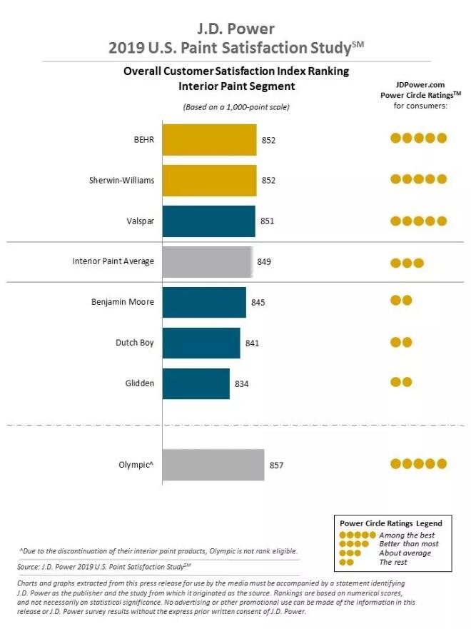 涂界记者注意到,在全球领先的市场研究机构J.D. Power(君迪)今年前不久发布的“2019年涂料满意度研究”(J.D.Fower 2019 Paint Satisfaction Study)显示,Behr百色熊再获“年度消费者最满意的内墙涂料”品牌,并且排名由去年的第2位上升至今年的第1位。