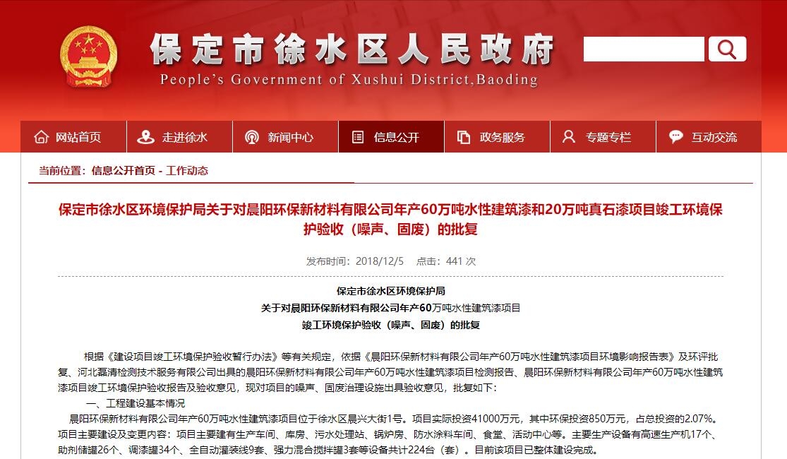 涂界记者注意到,该项目建设内容后来发生了变更,晨阳环保新材料有限公司投资41000万元建设年产60万吨水性建筑漆项目,投资42000万元建设年产20万吨水性真石漆项目,水性建筑涂料年产能达到了80万吨。此外,年产20万吨高端水性工业漆项目于2018年12月正式投产,该项目分为水性汽车漆与水性木器漆两大品类。自此,晨阳水漆年产100万吨水漆产业园项目全部建成投产。