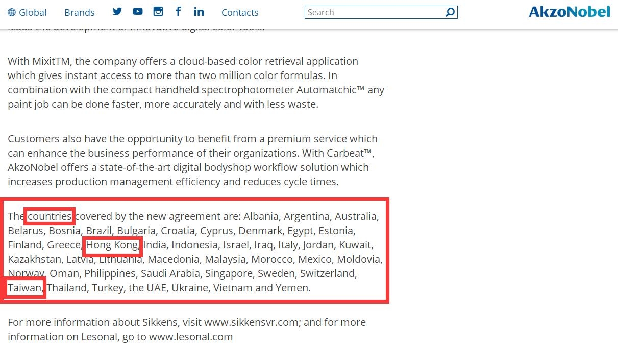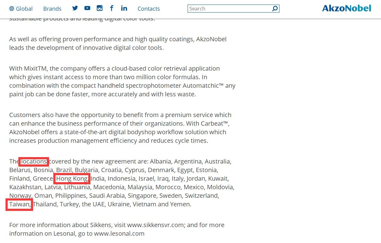 涂界记者2月20日获悉,全球涂料巨头阿克苏诺贝尔(AkzoNobel)将香港、台湾称为国家事件被《涂界》曝光后,该公司随后作了修改,将文章中的“countries”英文单词修改为“locations”(注:百度翻译为“地方”)。