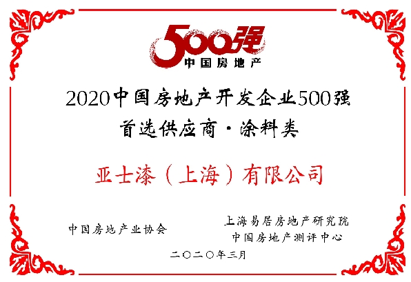 3月18日,“2020年中国房地产500强测评成果发布会暨500强高峰论坛”在线云发布,并揭晓了《2020中国房地产开发企业500强首选供应商服务商品牌测评报告》,亚士一举揽获该榜单五项大奖,其中连续九年蝉联中国房地产开发企业500强首选供应商品牌(涂料类)。