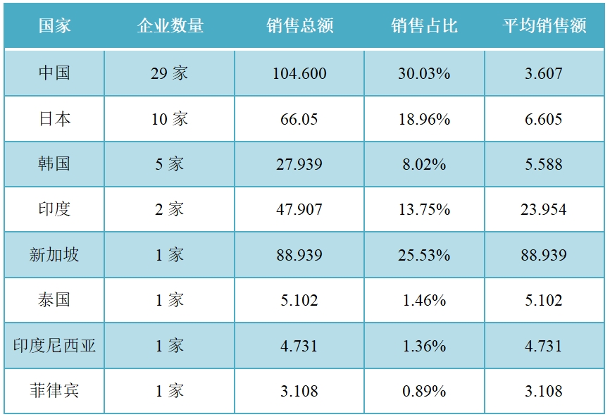 此外,韩国上榜企业累计销售收入为27.939亿美元,占榜单销售总收入的8.02%,平均每家企业销售收入为5.588亿美元;印度上榜企业累计销售收入为47.907亿美元,占榜单销售总收入的13.75%,平均每家企业销售收入为23.954亿美元。