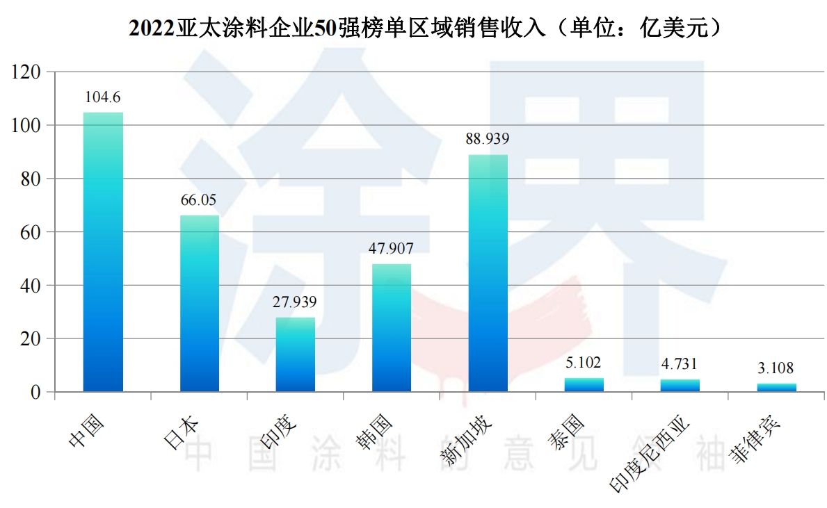 从经营收入来看,亚太地区涂料50强企业累计销售收入348.376亿美元,较往年新增了57.711亿美元,或同比增长19.85%;占全球总销售收入的17.02%,同比增长1点54个百分点;占亚太地区总销售收入的34.73%,同比增长3点14个百分点。