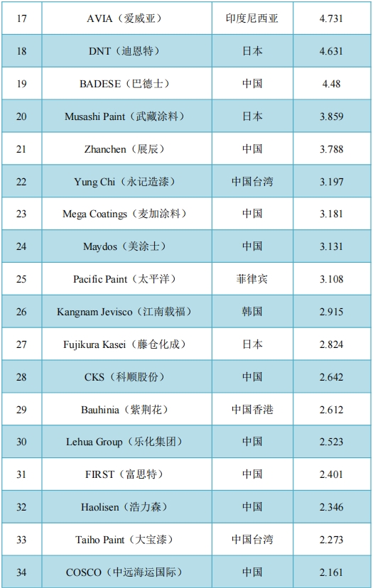 榜单显示,来自印度尼西亚的爱威亚,来自中国的德威特、君子兰3家企业为新入围企业。值得一提的是,华特集团、宝塔山漆、漆谷集团三家中国企业今年则退出了榜单。