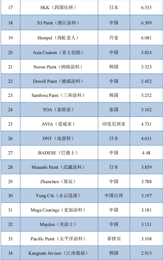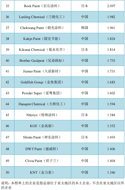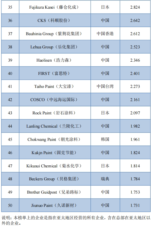2022亚太涂料企业50强榜单发布:29家中国企业上榜