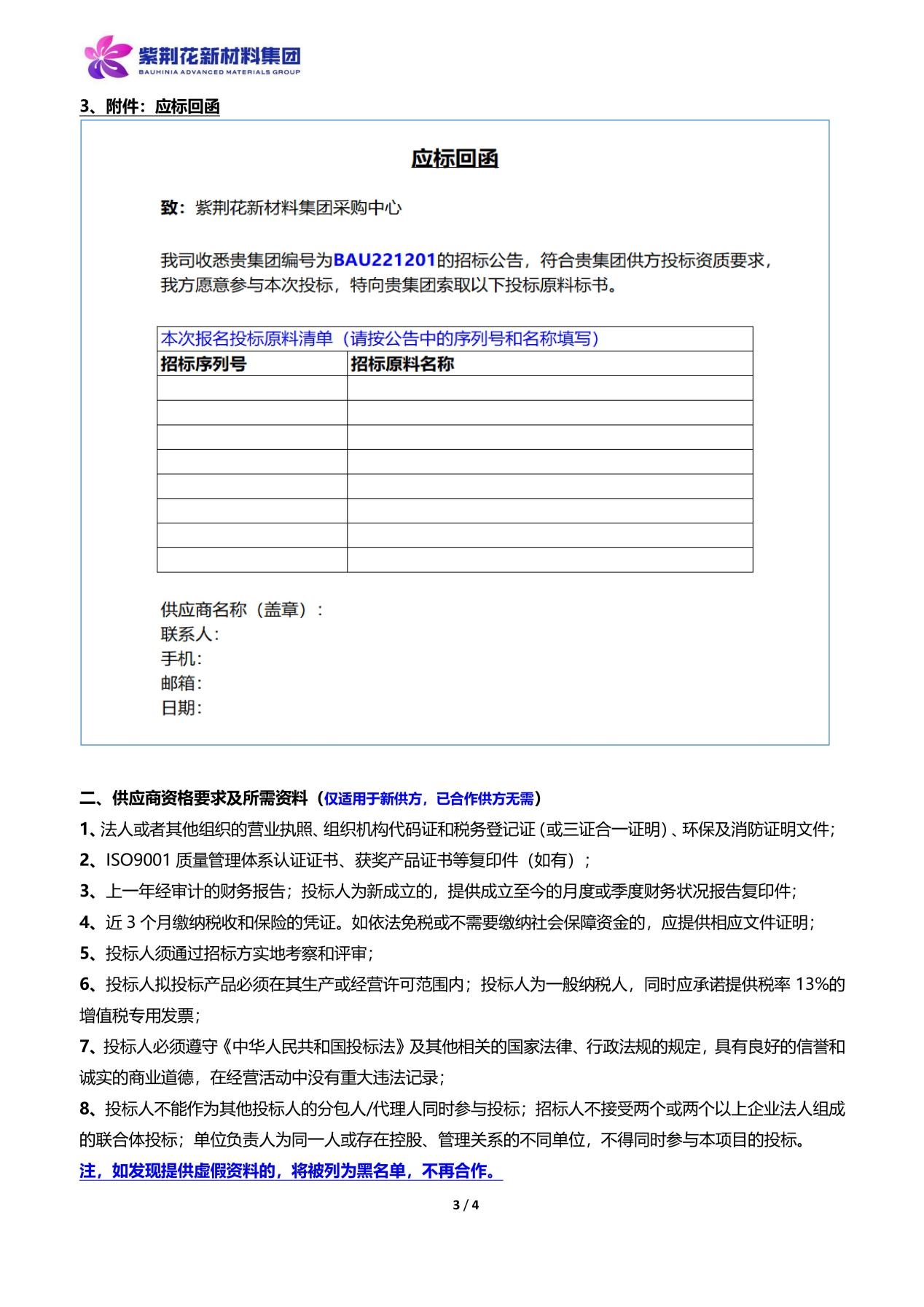 公开招标!紫荆花新材料集团2023年原材料招标通知