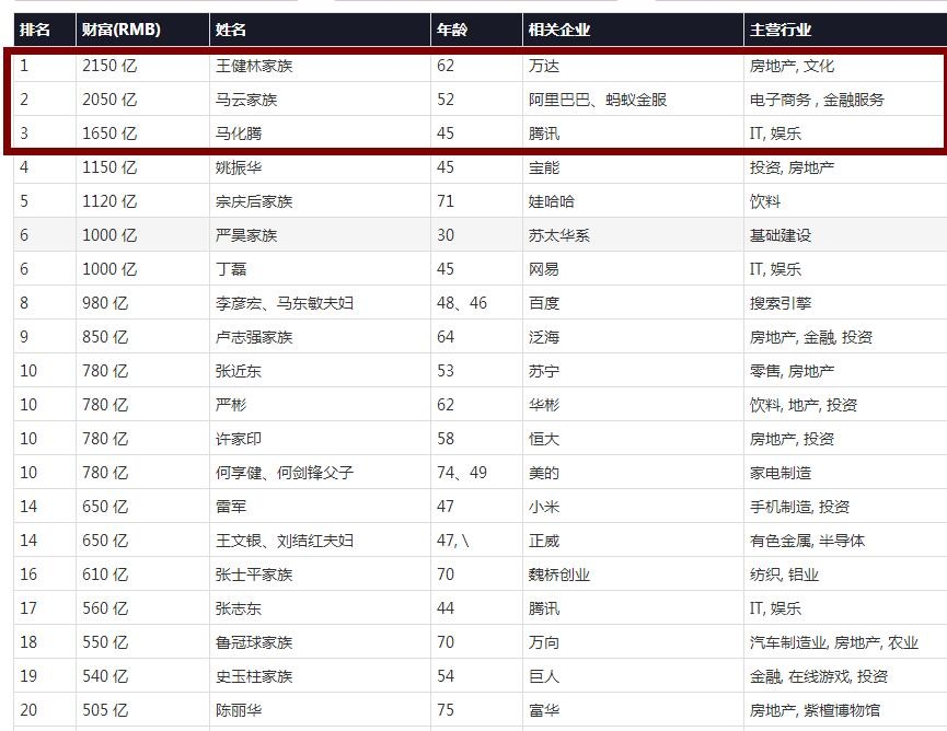 《2016胡润百富榜》新增179位企业家上榜,总人数比三年前翻了一倍;王健林以2150亿财富第三次成为中国首富,马云2050亿位列第二;“大黑马”姚振华1150亿进入榜单前五位。