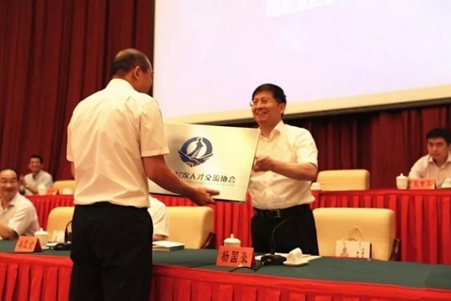图为福建省委组织部常务副部长杨国豪为莆田市高层次人才交流协会授牌,首任会长洪杰接牌