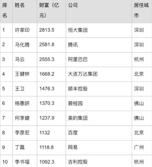 榜单显示,恒大集团许家印位居今年福布斯中国富豪榜榜首,其财富净值从去年的657亿元狂增至2814亿元。马化腾以2582亿元财富净值居榜单第二位。马云居榜单第三位,财富净值共计2555亿元。榜单前十名的富豪还有王健林(1668.2亿元)、王卫(1476.3亿元)、杨惠妍(1370.3亿元)、何享健(1237.9亿元)、李彦宏(1132亿元)、丁磊(1118.8亿元)、李书福(1092.3亿元)。