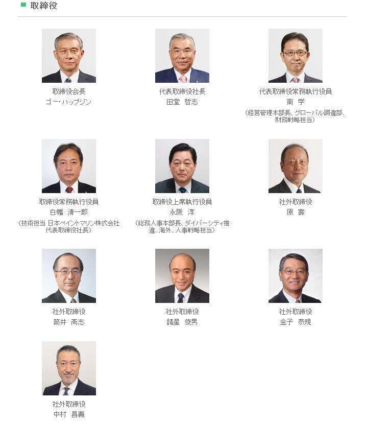 3月28日,日本立邦涂料控股株式会社(简称“立邦控股”)公布了集团最新的董事会管理结构。资料显示,立邦控股董事会董事成员目前有10名,分别为:吴学人(Goh Hup Jin),田堂哲志,南 学,白幡 清一郎,永阪 淳,原 寿、筒井 高志,诸星 俊男,金子 恭规,中村 昌义。