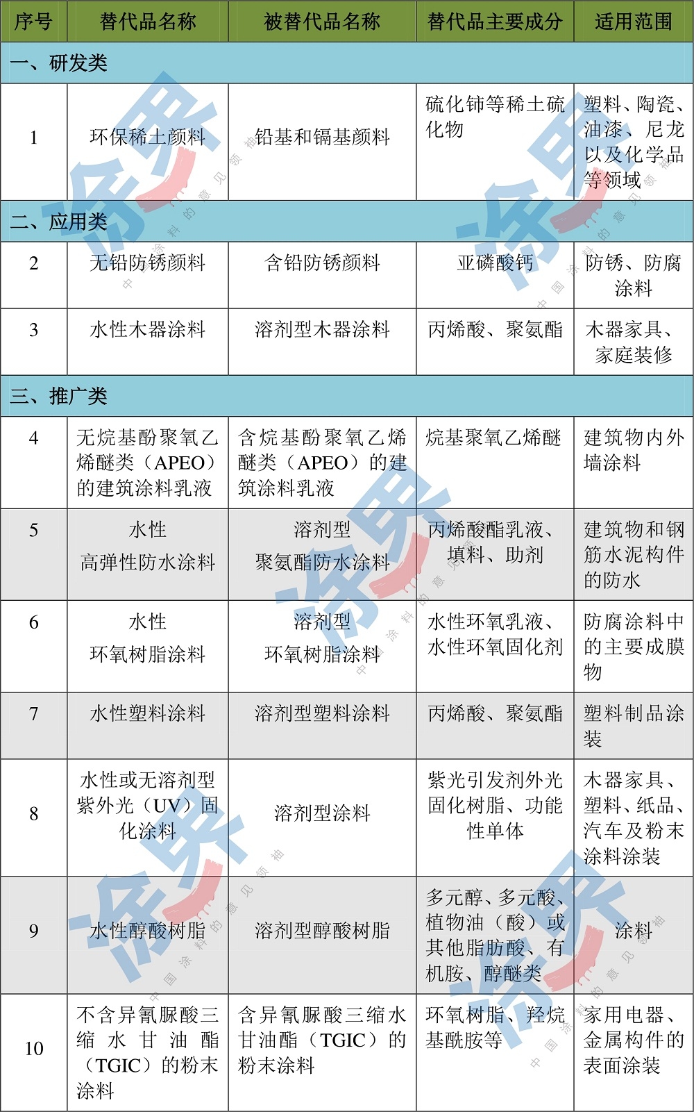 涂界记者注意到,该《目录》是工信部于6月30日印发的《工业绿色发展规划(2016-2020年)》内容中的一部分。该《规划》提出:要减少有毒有害原料使用。修订国家鼓励的有毒有害原料替代目录,引导企业在生产过程中使用无毒无害或低毒低害原料,从源头削减或避免污染物的产生,推进有毒有害物质替代。推进电器电子、汽车等重点产品有毒有害物质限制使用。实施挥发性有机物削减计划,在涂料、家具、印刷、汽车制造涂装、橡胶制品、制鞋等重点行业推广替代或减量化技术。