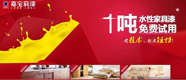 为庆祝阿里巴巴旗舰店开业,嘉宝莉集团特拿出1吨水性家具漆,征集水性家具厂或家装业主免费试用,以倡导水性木器漆的使用,降低能源消耗,减轻雾霾等环境污染。