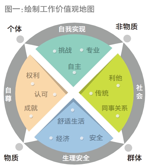 依此我们可以绘制一张工作价值观地图。(见图一)