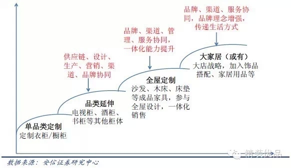 定制家居企业,通过制造业延伸,行业规模将成几何倍数增长。定制家居行业的核心优势是通过个性化设计,按照业主家的装修风格、尺寸、喜好、要求量身定制,将信息化与工业化融合,从购买意向到了解户型,从提出设计需求、完成设计方案,再到下单和生产、发货,通过全流程信息化,实现生产的规模化、柔性化、个性化的,实现大规模定制,就是行业当前所热门的“家居工业4.0“。正是由于这样基于消费者核心需求,才使得定制家居行业成为地产后周期时代唯一高速成长家居子领域。