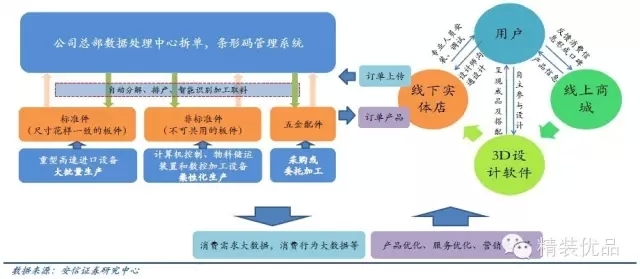 第一,通过数据库形成强大的云设计能力。尚品宅配搭建了一个大的数据平台,“以云计算为技术支持的空间方案云平台”。尚品宅配根据房屋户型,依托强大的数据库和软件技术实力,免费量身设计,消费者先看设计,满意后再买家具,并进而利用强大的IT技术实现定制产品的规模化制造,即可以同时大规模生产海量消费者的个性化产品并实现快速配送,这一开创性不仅在定制家具界,在整个家居乃至中国制造界都极具革命价值。