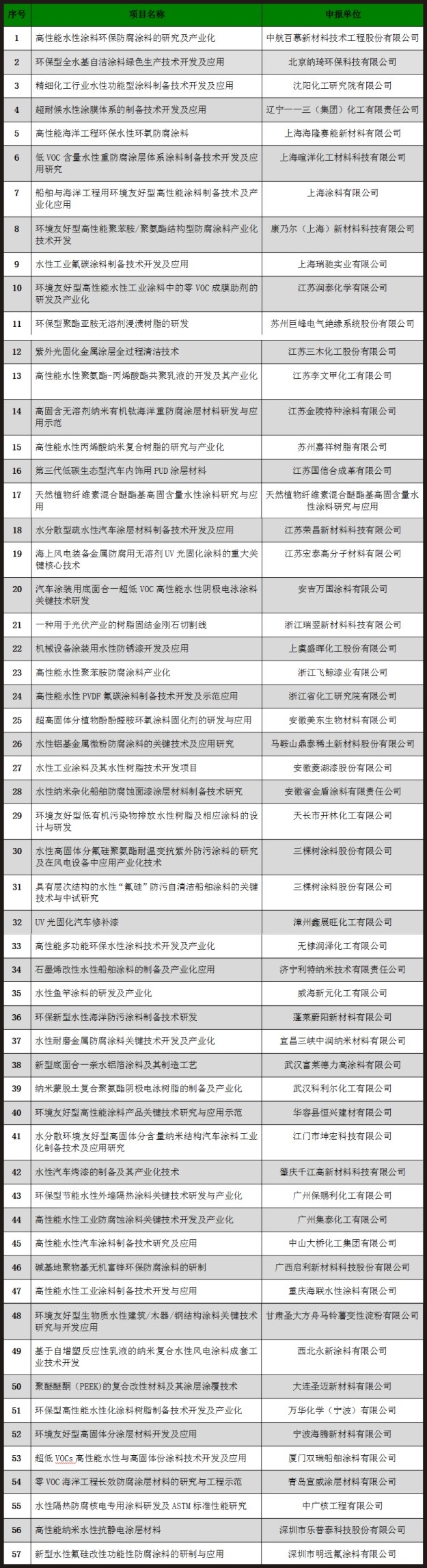 涂界记者了解到,中航新材、上海涂料、江苏金陵、荣昌新材、江苏宏泰、飞鲸漆业、菱湖漆、金盾涂料、三棵树涂料、西北永新、鑫展旺、蔚阳新材、集泰化工、大桥化工、海腾新材等56家涂料企业在列,共申报了“水性高固体分氟硅聚氨酯耐温变抗紫外防污涂料的研究及在风电设备中应用产业化技术”等57个项目。项目名称及申报单位如下表: