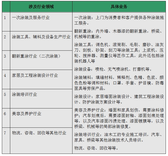 涂料后市场的最早的分类是以涂料产品销售的前、后顺序进行分类的,大体上可分为七大行业:一是,一次涂装及服务行业;二是,涂装工具、辅料及设备生产行业;三是,重涂翻新行业;四是,家居及工程涂装设计行业;五是,涂装培训行业;六是,美容及养护行业;七是,物流、咨询、回收等其他行业,其中包括金融行业、IT行业、咨询行业等等。