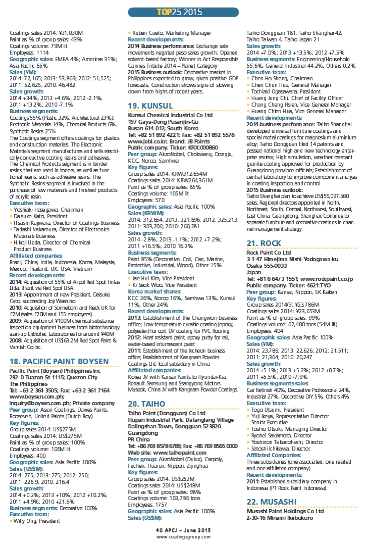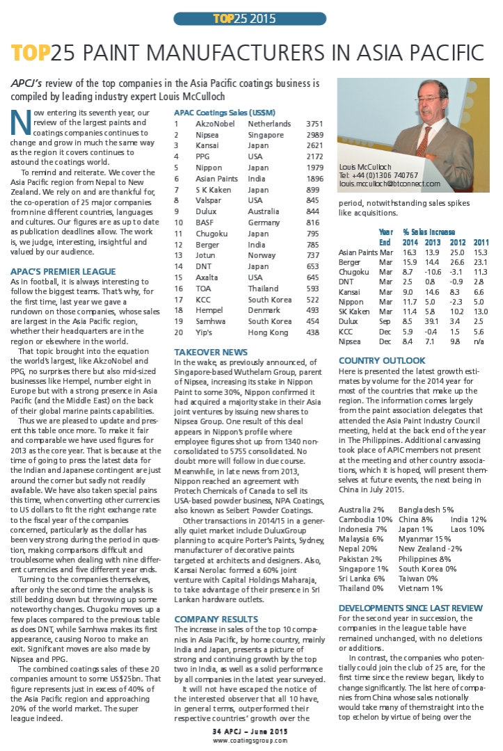 近日,《亚太涂料杂志》(APCJ)公布了“2014年亚太地区涂料企业25强”榜单。此外,还公布了“2014年亚太地区涂料制造企业20强”榜单,该榜单是在亚太地区经营的全球性企业,只计算企业在亚太地区的2014年度销售数据。