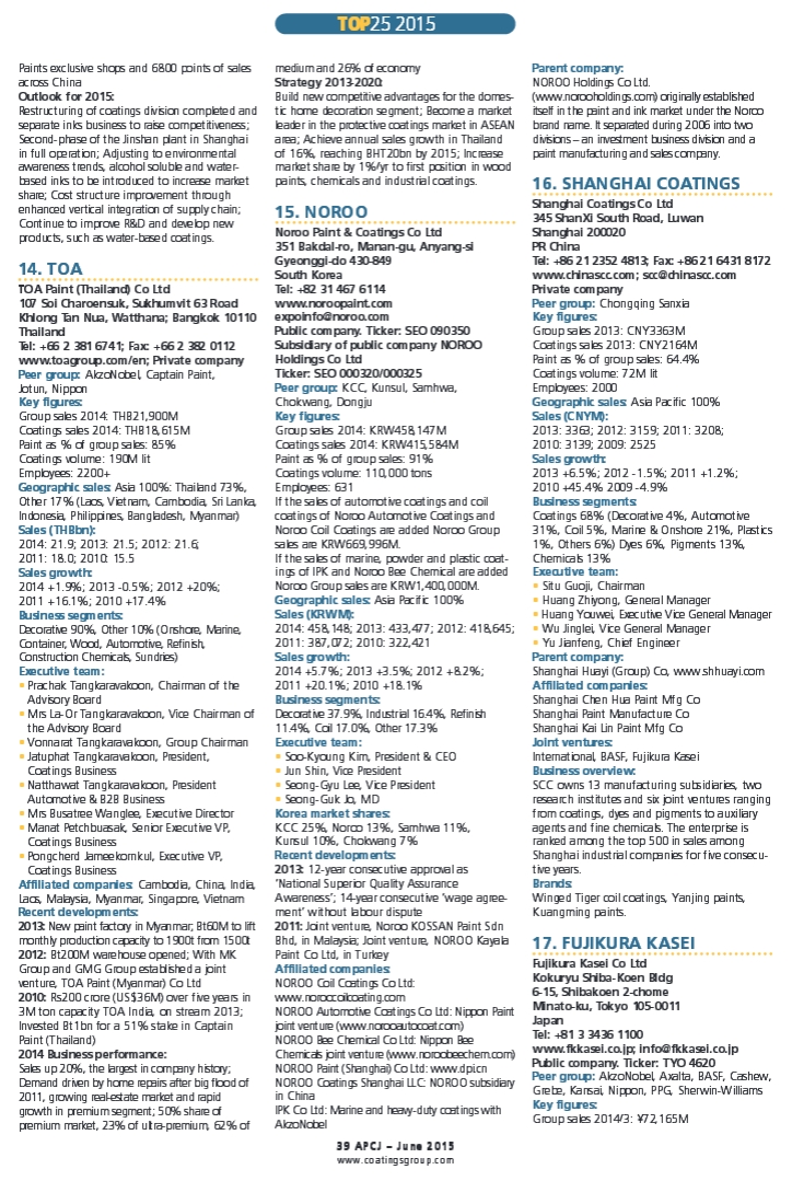 “2014年亚太地区涂料企业25强”榜单