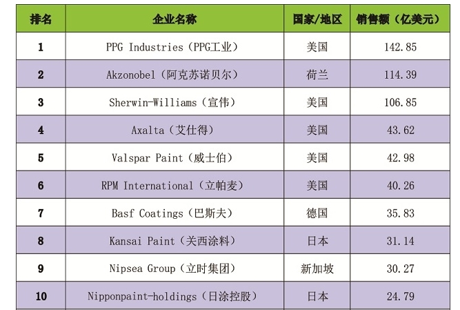 根据榜单来看,上榜企业最低入围门槛为1.62亿美元。美国PPG、荷兰阿克苏诺贝尔、宣伟位居前三甲,都超过100亿美元,艾仕得、威士伯、立帕麦、巴斯夫、关西涂料、立时集团、日涂控股依次列第4-10位。