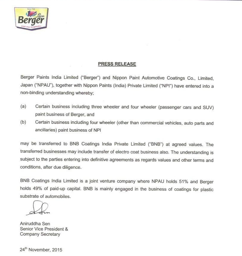 2015年11月24日,立邦中国母公司——日本涂料控股株式会社发布公告称,公司与Berger Paints India Limited(BPI)、Nippon Paint Automotive Coatings Co Ltd、Nippon Paint (India) Private Limited、BNB Coatings India Private Limited签订了汽车涂料业务重组协议。