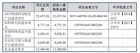 根据资料显示,嘉宝莉此次IPO申请上市的证券交易所为“上海证券交易所”,拟发行股票4000万股,拟募集资金约5.3亿元,主要拟用于5大项目的投资:10万吨涂料及配套产品建设项目、涂料研究院建设项目、营销网络改造升级项目、信息化升级与集成平台建设项目,以及补充流动资金。