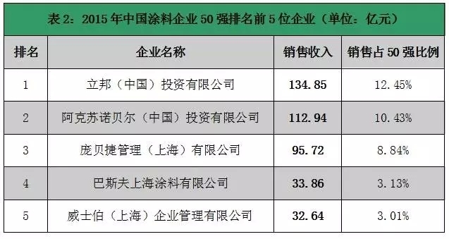 根据国内涂料产业首家财经媒体《涂界》去年发布 “2015年中国涂料企业50强排行榜”显示,PPG中国以年销售额95.72亿元位居第三位,立邦中国则以134.85亿元位居第一位,阿克苏诺贝尔中国以112.94亿元位居第二位。