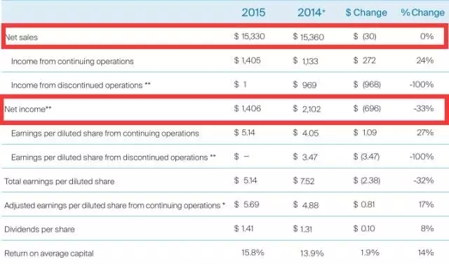 PPG工业2014年-2015年销售额及净利润数据