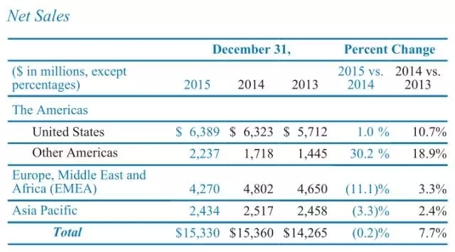 PPG工业2015年各区域销售额情况