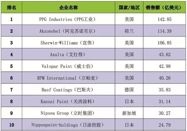 根据《涂界》(Coatings Industry)发布的“2015年世界十大涂料制造商排行榜(Top Ten Coatings Manufactrer)”显示,PPG工业以涂料销售额142.85亿美元位列排行榜榜首,阿克苏诺贝尔则以114.39亿美元位居第二位。据悉,这是PPG首次超越阿克苏诺贝尔。