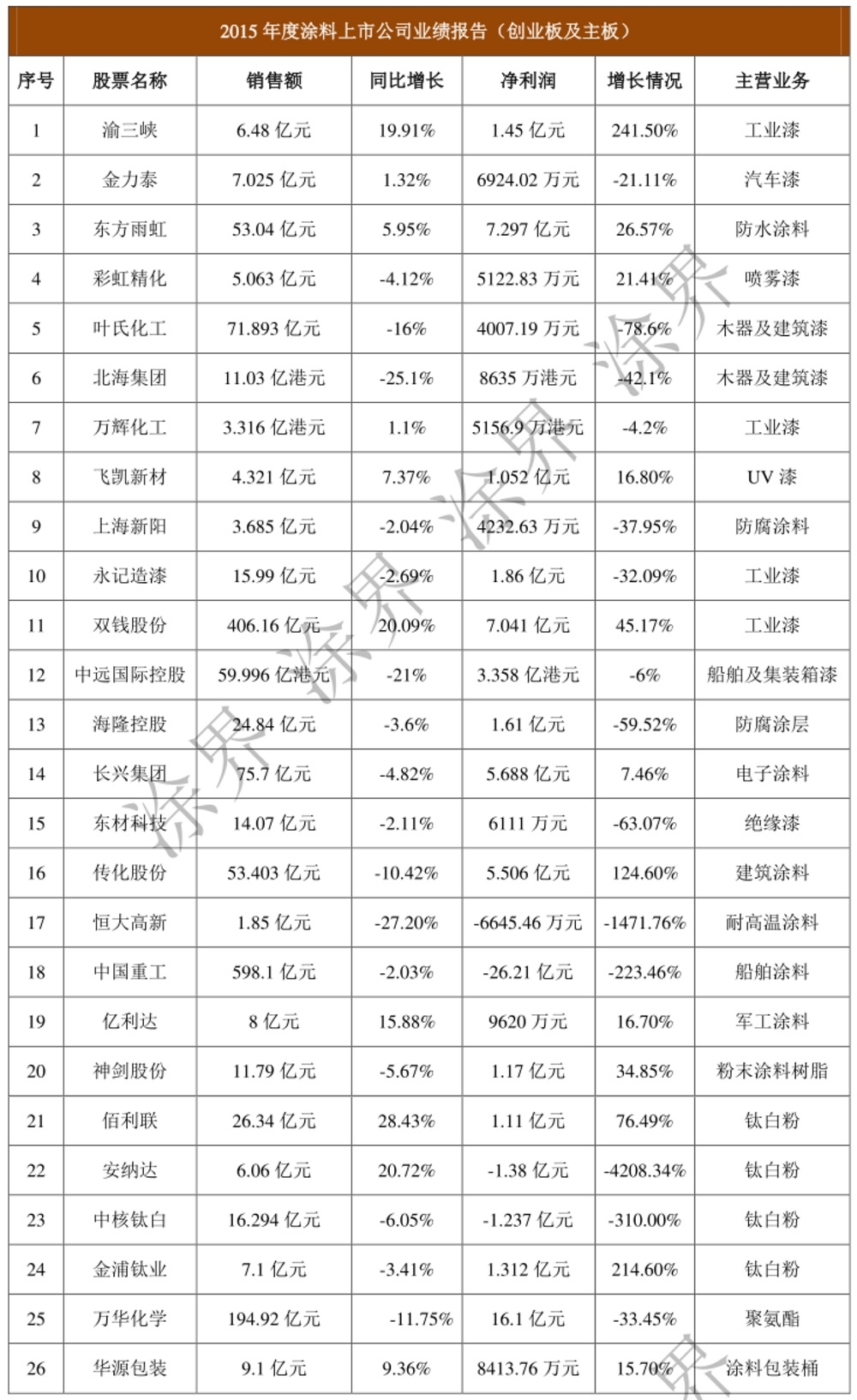 7)华谊精化(原上海涂料)为双钱股份旗下全资子公司,2015年实现营业收入为29.528亿元,其中涂料及树脂产品营业收入为14.55亿元,同比下降4.14%;净利润为2.034亿元。