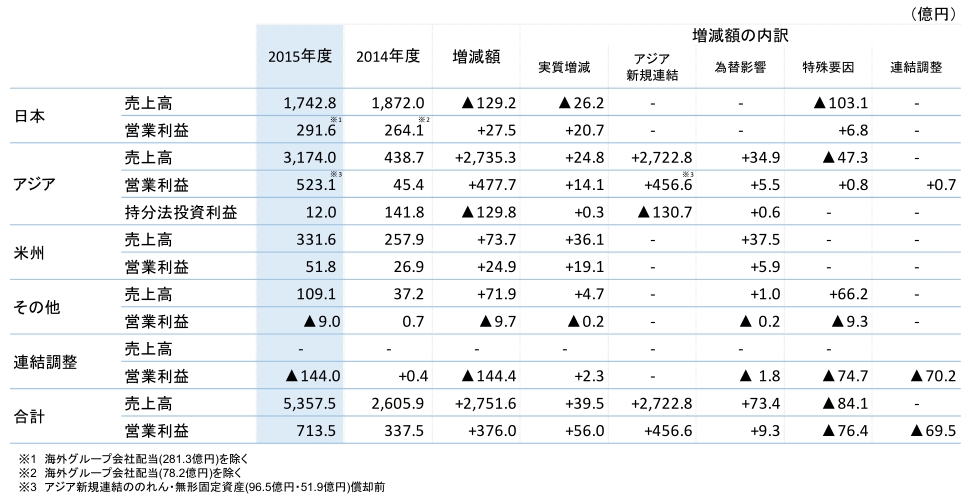 由于该地区汽车生产台数增加等,使得销售额增加了。同时,由于美元高(日元贬值),日本进口原料成本降低,持续成本降低的活动,收益性大幅改善。结果是,本地区合并销售额为331.56亿日元,比上年同期增加28.5%;综合营业利润51.77亿日元,比上年同期增加92.8 %。
