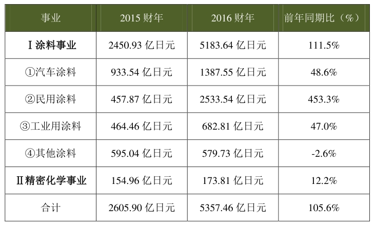 报告显示,日涂控股涂料事业部2016财年实现销售额5183.64亿日元,同比增长111.5%,其中:汽车涂料实现销售额1387.55亿日元,同比增长48.6%;民用涂料实现销售额2533.54亿日元,同比增长453.3%;工业用涂料实现销售额682.81亿日元,同比增长47.0%;其他涂料实现销售额为579.73亿日元,同比下降2.6%。精密化学事业部2016财年实现销售额173.81亿日元,同比增长12.2%。(如下表)