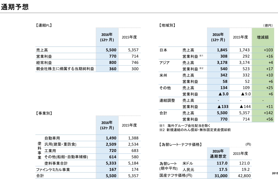 日涂控股对今年业绩进行了预想,2016年度将实现营业收入5500亿日元,净利润为800亿日元,净利润为360亿日元。